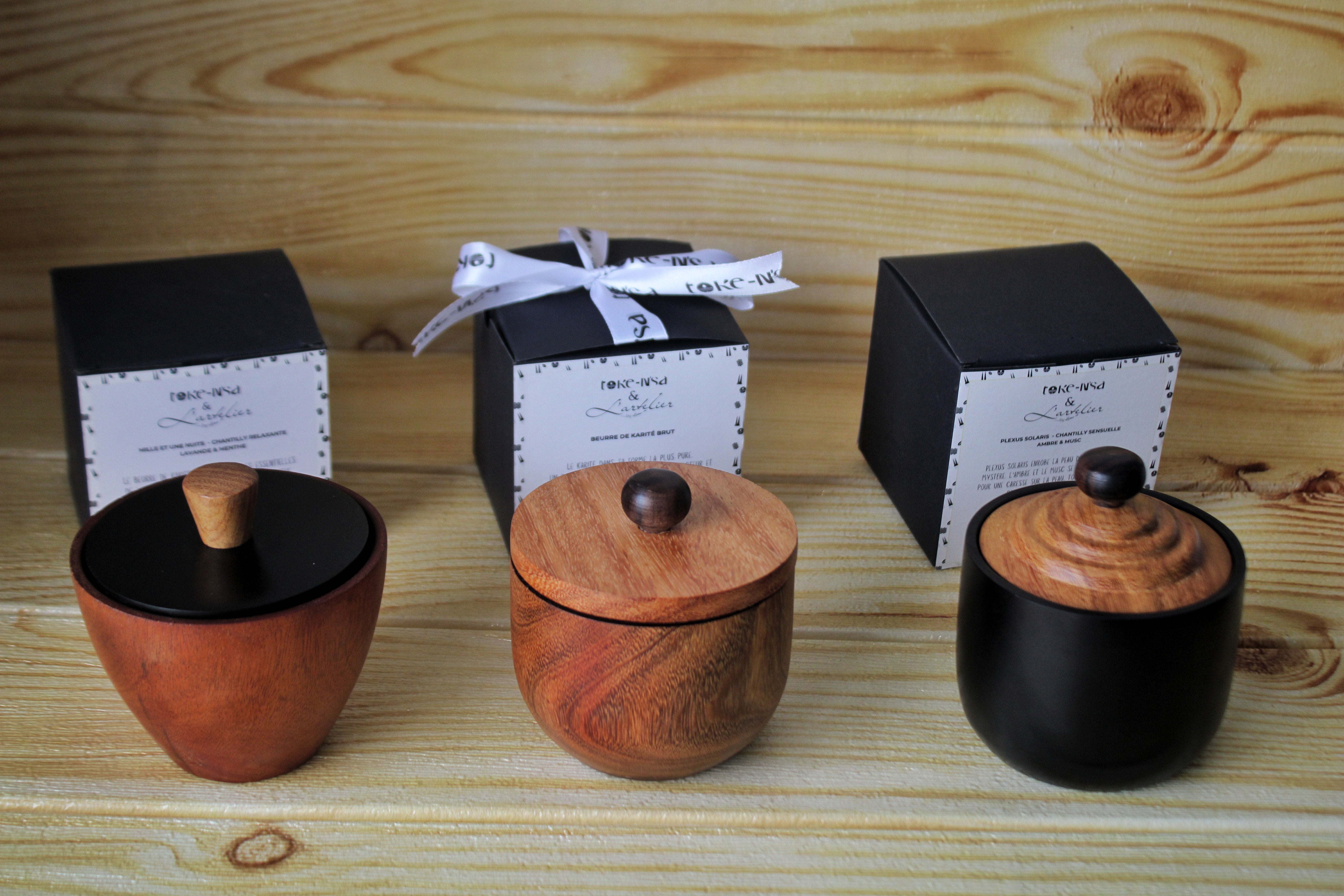 La collection Bois Sacrés célèbre deux héritages : le karité Toke-nsa, travaillé à la main selon les traditions du Nord Togo, et l’art du bois, façonné par une maison d'ébénistes passionés.